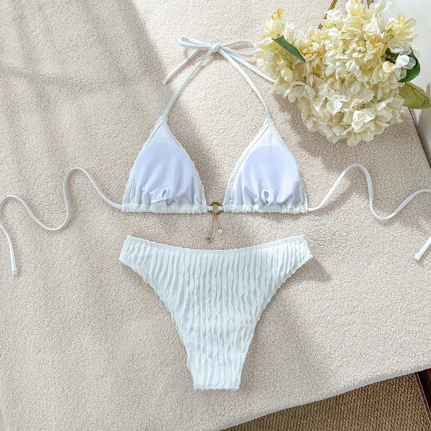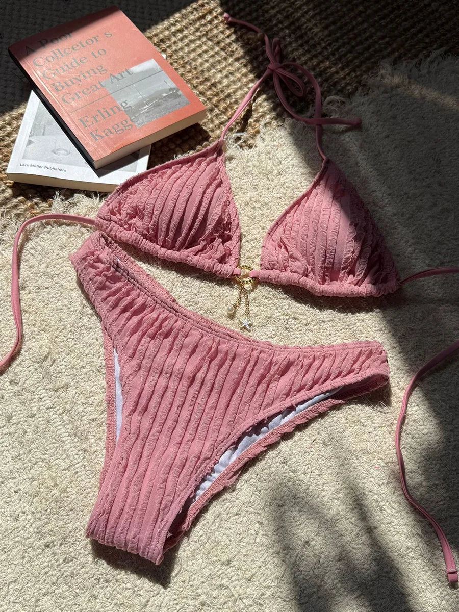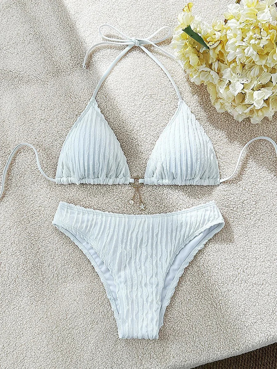 סט ביקיני בעיצוב מלא סטייל עם קשירה בצוואר ופרטי מלמלות שמוסיפים טאץ’ נשי ועדין. גזרה מחמיאה עם אפקט הרמה עדין למראה מושך ונוח – מושלם לים, לבריכה ולחופשות קיץ
