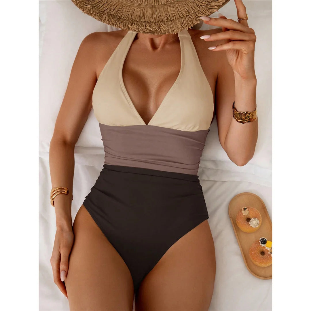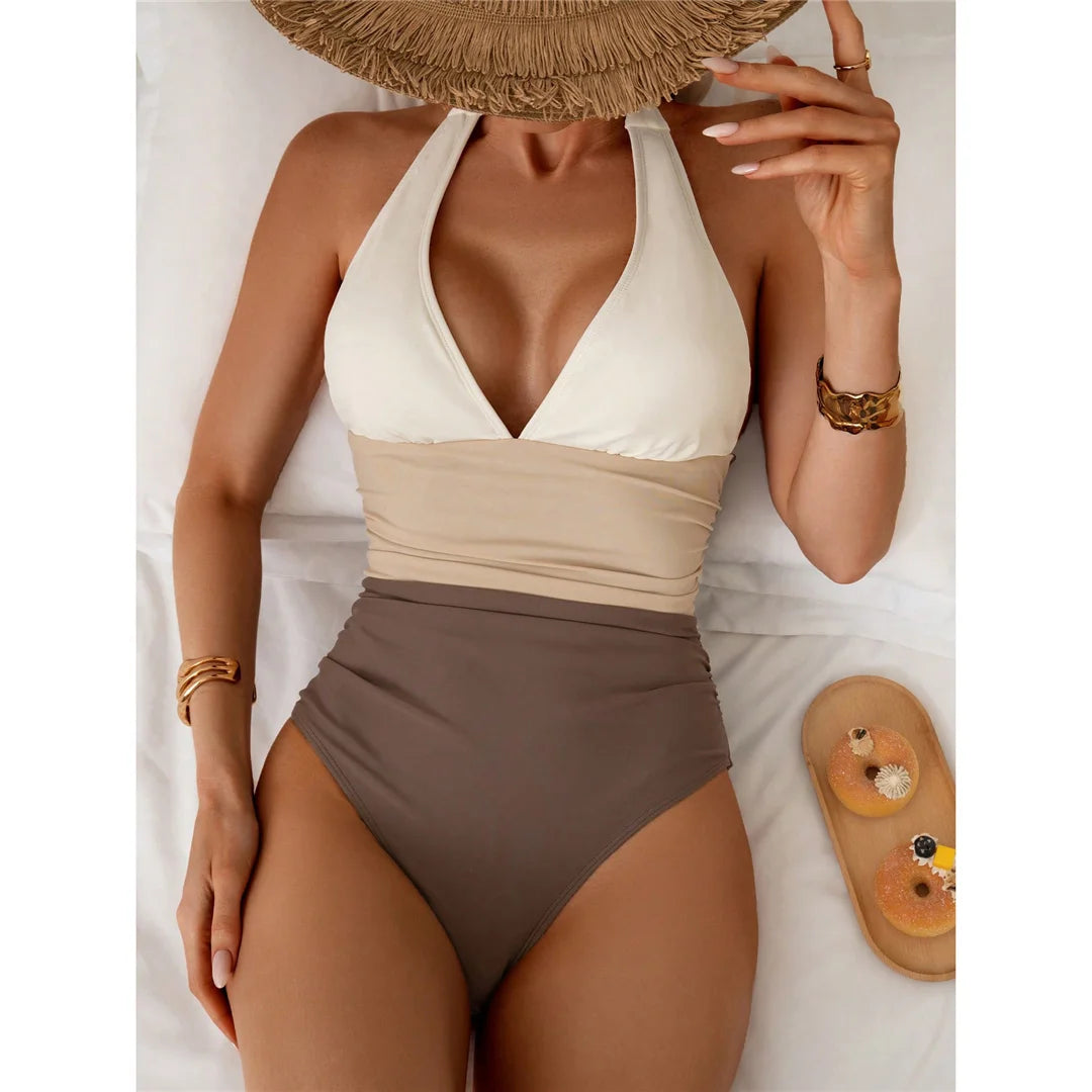 בגד ים שלם בעיצוב אופנתי עם שילוב צבעים מחמיא וקשירה בצוואר להתאמה נוחה. כולל ריפוד עדין, עשוי מבד גמיש ואיכותי למראה מחמיא ונוחות לאורך כל היום